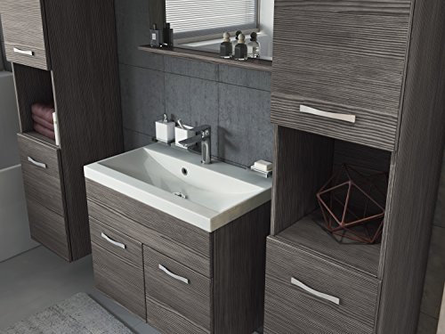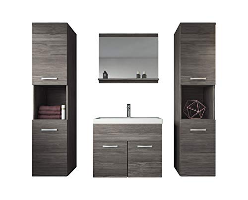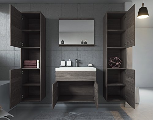 Dieses Set besteht aus einem Waschbecken, einem Waschbeckenunterschrank, zwei Hochschränke sowie einem Spiegel.
