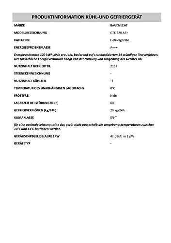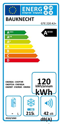Bezeichnung: Bauknecht GTE 220 A3+Energieeffizienzklasse Skala von A+++(niedriger Verbrauch) bis D(hoher Verbrauch): A+++Energieverbrauch pro Jahr (kWh): 120Klimaklasse: SN-TTüranschlag: Left & RightLagerzeit bei Störung (h): 60Bruttogewicht (kg): 47.7Gefrierleistung (kg/24 Std.): 20Nettovolumen gesamt (Liter): 215Nettovolumen Kühlteil (Liter): Nettovolumen Gefrierteil (Liter): Maximale Geräuschentwicklung im Betrieb in Dezibel: 42Sterne-Kennzeichnung Gefrierteil: 4Gerätemaße (H x B x T) (mm): 916x1180x698