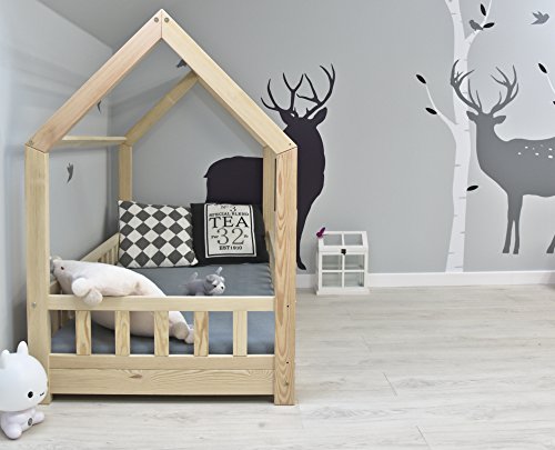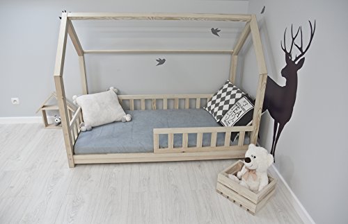 Best For Kids Kinderbett Kinderhaus mit Rausfallschutz Jugendbett Natur Haus Holz Bett mit oder ohne 10 cm Matratze in 8 Größen (90×200 cm mit Matratze)
