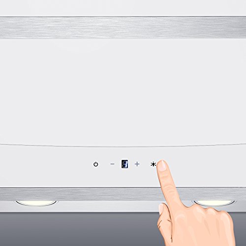 Die Kapuze besitzt die neueste Touch Gefühl und digitale LED-Anzeige positioniert Mitte der Dunstabzugshaube, 3 verschiedene Geschwindigkeitsstufen für bessere Kontrolle über die extrem leistungsstarke 650 m³/h Förderleistung und Bedienelemente für einfache und zuverlässige Bedienung.
