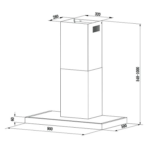 Sie verfügt über alle üblichen Ausstattungen, wie die LED-Lampen, damit Sie beim Kochen besser sehen können, 3 verschiedene Geschwindigkeiten zur Steuerung der extrem leistungsstarken 550 m³/h Förderleistung und Bedienelemente für eine einfache, zuverlässige Bedienung. Diese Dunstabzugshaube kann problemlos an der Wand über dem Herd montiert werden und reicht bis zur Zimmerdecke (Abmessungen entnehmen Sie bitte der abgebildeten technischen Zeichnung).