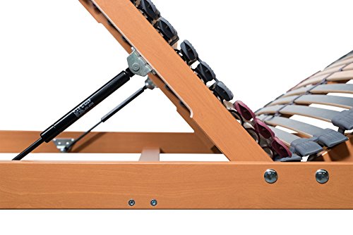Das Kernstück sind unsere bärenstarken Gasdruckfedern, die ein leichtes öffnen des Lattenrostes am Fußende auch unter Belastung durch die Matratze garantieren. Nun ist das Verstauen im Bettkasten kein Problem mehr. Aus hygienische Gründen wird der Rahmen in Kirschbaumoptik ummantelt . Dies ermöglicht, den Rahmen durch die glatte Oberfläche leicht zu reinigen und hygienisch sauber zu halten. Unsere im Rahmen verarbeiteten Federholzleisten werden ausschließlich aus nachhaltigem Anbau bezogen. Die Lattenrahmen sind TÜV GS gesichert geprüft ID: 1111212908