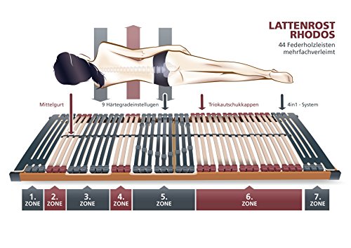 Der Lattenrahmen Rhodos KF mit Bettkastenfunktion besticht durch seine sehr gute Verarbeitung und Funktionsweise. 44 Qualitätsfederholzleisten welche in Trio-Kautschukkappen, Holm-überdeckend gelagert werden, sorgen für Ihren körpergerechten Liegekomfort. Die 18, im Mittelbereich befindlichen Härtegradregler, werden für die Feinabstimmung und für ein noch ein besseres Schlaferlebnis, benötigt. Die Federholzrahmen sind grundsätzlich mit einem lastverteilenden Mittelgurt ausgestattet, dadurch ist eine Belastung von 180 kg, dauerhaft möglich. Das Kopfteil lässt sich leicht durch Qualitätsbeschläge verstellen um somit das Kopfteil in die gewünschte Position zu Heben oder zu Senken.