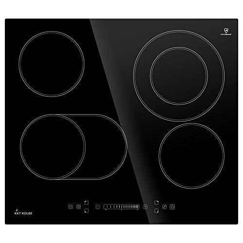 Das KKT KOLBE Heizspiralen-Kochfeld überzeugt durch eine hochwertige Verarbeitung und Funktionalität. Das Kochfeld verfügt über 4 Kochzonen. Die Dual-Kochzone und Bräterzone haben jeweils zwei Kochstellen, so dass Sie den einen zentralen separat und zusammenhängend mit dem jeweiligen äußeren Abschnitt benutzen können. Die Oberfläche aus hochwertiger SUPERKERAMIK-Glaskeramik sorgt für Qualität und Sicherheit und ist einfach zu reinigen. Das Gerät ist autark, kann also unabhängig von anderen Geräten in Ihre Küche eingebaut werden. Das Gerät kann mittels TouchSelect Sensortasten bequem bedient werden. Mit dem Slider des Bedienpanels können Sie mit einem Wisch die Temperaturstufe der Kochplatten einstellen. Die LED-Anzeige zeigt alle wichtigen Informationen bequem auf einen Blick. Jede Kochzone kann neunstufig geregelt werden und garantiert so die optimale Temperatur für alle Speisen. Ein eingebauter Sensor überwacht die Temperatur, um Schäden zu vermeiden. Das Kochfeld schaltet sich dadurch bei zu hoher Temperatur automatisch ab. Falls eine Kochzone noch heiß ist, werden Sie von einer LED-Lampe davor gewarnt. Mit der Timer-Funktion können Sie Kochzonen zeitgesteuert abschalten. Wenn sich kein passendes Kochgeschirr auf der Kochzone befindet, wird diese automatisch abgeschaltet. Die Breite des Kochfelds beträgt 59cm. Gewährleistung: 2 Jahre Kochfeld-Art: Elektrisch Besonderheiten: Autarkes Kochfeld Farbe: Schwarz Oberfläche: Glaskeramik Anzahl der Kochplatten: 4 Kochfelder Details: 2000W/1100W Zone 270-165mm, 2200W/1000W Zone 230mm, 2x 1200W Zone 165mm Leistung: 6600W Spannung: 220-240 Einbaumaße: 56,2×49,2cm Breite: 59 Höhe: 5,5 Länge: 52 Gewicht: 8,3