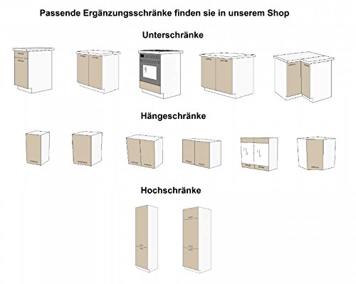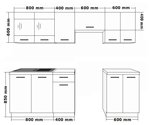 • inklusive: Spülenunterschrank (80 cm), Glashängeschrank (80 cm), Kurzhängeschrank (60 cm), zwei Unterschränke (60 cm/40 cm), zwei Hängeschränke (60 cm/40 cm)