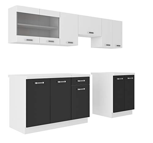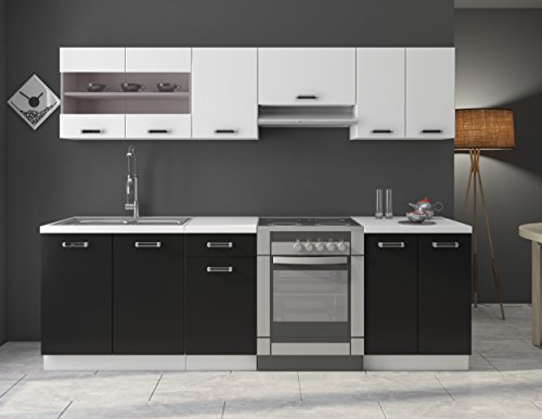 Mit dieser Küchenzeile in den Farben Schwarz + Weiss verleihen Sie Ihrer Küche ein modernes Ambiente. Die siebenteilige Küche ist individuell stellbar und lässt sich so in jede moderne Küche integrieren. Die vielen Schränke bieten genügend Stauraum, um Küchenutensilien zu verstauen. Die stabilen Arbeitsflächen in einer Arbeitshöhe von 85 cm bieten viel Raum für Kreativität.