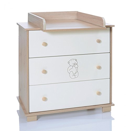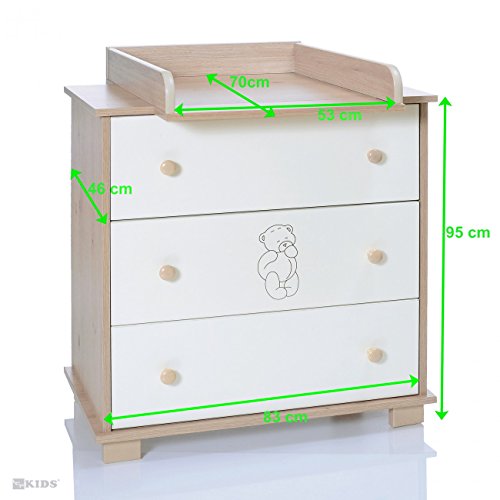 Lange Nutzungsdauer durch leicht abnehmbaren Wickelaufsatz. So kann die Kommode auch nach dem Wickelalter platzsparend im Kinderzimmer genutzt werden. Wickelkommode mit 3 großen Schubladen sorgt für ein üppiges Platzangebot. Genügend Stauraum für wichtige Utensilien beim Wickeln.