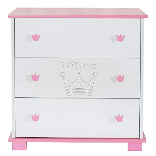 Besonders schön und auffällig wirken zu einem die in eine der 3 Schubladen Frontelemente ins Holz eingravierte Prinzessinen Krone. Eine weitere Besonderheit sind die 6 Griffe der Schubladen aus kleinen Kronen in rosa.