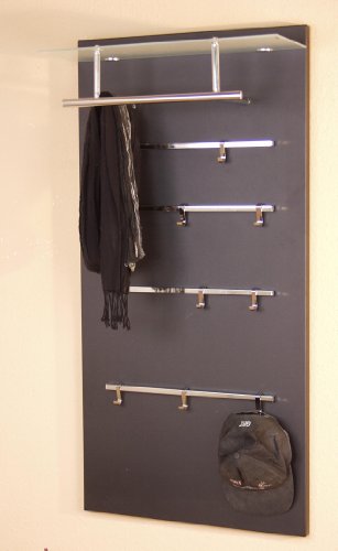 Modernes Wandgarderobenpaneel mit einem Glasboden aus Sicherheitsglas, darunter chromfarbene Kleiderstange aus Stahlrohr. Auf dem Paneel sind insgesamt 4 chromfarbene Metallleisten aufgesetzt, mit insgesamt 8 Kleiderhaken, die individuell angebracht werden können. Paneele ist aus MDF, schwarz beschichtet. Ohne Dekoration.