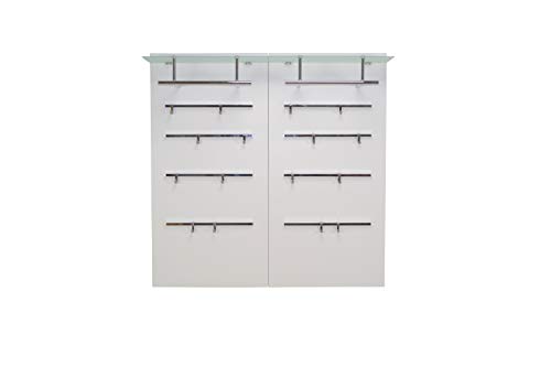 Modernes Wandgarderobenpaneel mit einem Glasboden aus Sicherheits-Milchglas, darunter chromfarbene Kleiderstange aus Stahlrohr. Auf dem Paneel sind insgesamt 4 chromfarbene Metallleisten aufgesetzt, mit insgesamt 8 Kleiderhaken, die individuell angebracht werden können. Paneele ist aus MDF, weiß beschichtet. Ohne Dekoration. Im Lieferumfang ist die Paneele wie beschrieben. Wenn mal mehr Platz benötigt wird, lassen sich auch problemlos zwei nebeneiander montieren.