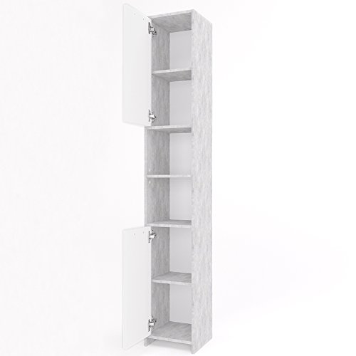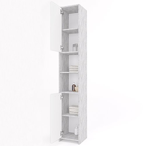 Der pflegeleichte und feuchtigkeitsbeständige Badschrank ist Melaminharz-beschichtet und mit Metallscharnieren und Auszügen ausgestattet.