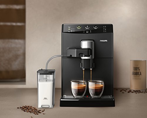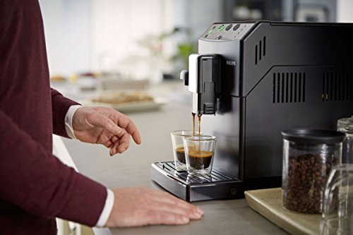 Mit dem Philips HD8829/01 Kaffeevollautomat der Philips 3000 Serie ist der Lieblings-Cappuccino nur einen Knopfdruck entfernt. Dank der großen Kapazität und des kompakten Designs kann man Espresso, Kaffee und Cappuccino aus frischen Bohnen auf Knopfdruck genießen. Cappuccino auf Knopfdruck war noch nie so einfach wie mit dem Easy Cappuccino-System. Dank Zweifachfunktion kann man auch zwei Tassen Kaffee gleichzeitig zubereiten. Die Granularität des Keramik-Mahlwerks lässt sich auf 5 verschiedene Stufen einstellen. Durch einen einfachen Druck auf die Aroma Plus-Taste genießt man zudem im Handumdrehen einen stärkeren Espresso, Kaffee oder Cappuccino. Der Kaffeeauslauf lässt sich bequem auf eine Höhe von bis zu 152 mm justieren. Die Philips HD8829/01 wurde für eine automatische Reinigung des Kaffeekreislaufs mit Wasser beim Starten oder Ausschalten entwickelt, für großartigen, frischen Geschmack bei jeder Tasse Kaffee.