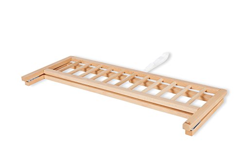 Vollmassiv: Buche, unbehandelt. L 90 cm, B 32 cm, H 36 cm. Zum Schutz vor dem Herausfallen aus dem Bett. Kein Zusammenbau erforderlich. Zum Schieben unter die Matratze. 1 Verbindungsgurt zur optimalen Befestigung am Lattenrost. Geeignet für Matratzen bis zu einer Höhe von 15 cm.