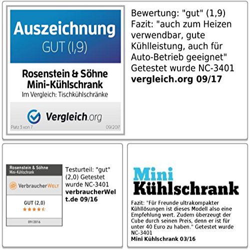 , Mini Kühlschrank (03/16): Fazit: „Für Freunde ultrakompakter Kühllösungen ist dieses Modell also eine Empfehlung wert. Zudem überzeugt der Cube durch seinen Preis, denn er ist für unter 40 Euro zu haben.“ Getestet wurde NC-3401