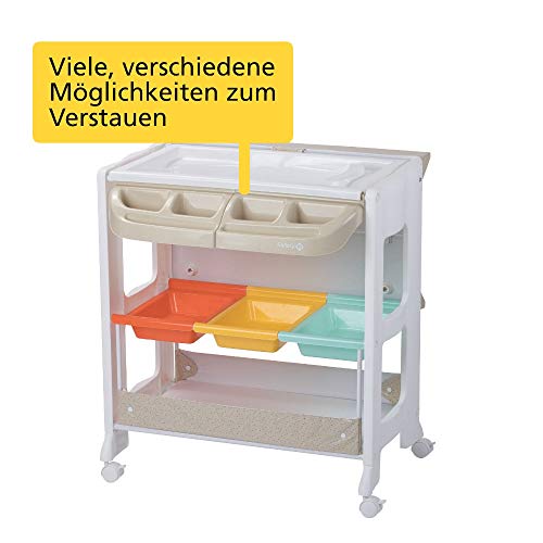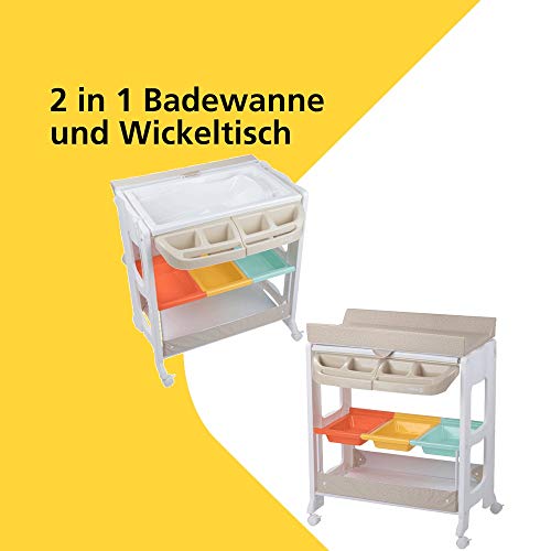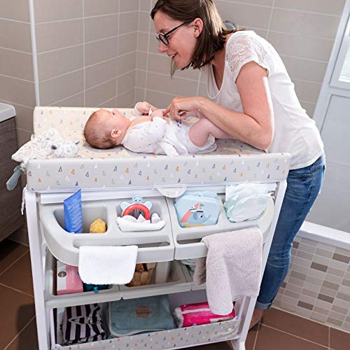 Tout en 1 : baignoire et table a langer. Utilisable des la naissance et jusqu'a 11 kg. Matelas a langer confortable amovible.Rangements : 4 compartiments avec accroche-serviettes, 3 boxes de rangements et 1 large �tagere de rangements. 4 roues avec freins. Grande stabilit� pour une s�curit� maximale.