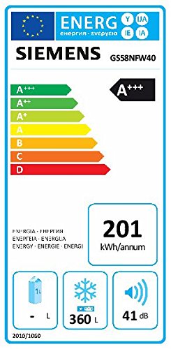 Bezeichnung: Siemens GS58NFW40Energieeffizienzklasse Skala von A+++(niedriger Verbrauch) bis D(hoher Verbrauch): A+++Energieverbrauch pro Jahr (kWh): 201Klimaklasse: SN-TTüranschlag: rechts wechselbarLagerzeit bei Störung (h): 25Bruttogewicht (kg): 105Gefrierleistung (kg/24 Std.): 22Nettovolumen gesamt (Liter): 360Nettovolumen Kühlteil (Liter): Nettovolumen Gefrierteil (Liter): Maximale Geräuschentwicklung im Betrieb in Dezibel: 41Sterne-Kennzeichnung Gefrierteil: 4Gerätemaße (H x B x T) (mm): 1910x700x780