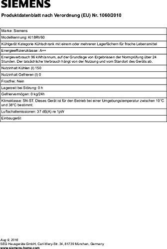 Siemens KI18RV60 iQ100 Einbau-Kühlschrank / A++ / Kühlteil: 150 L / weiß / SafetyGlas-Ablagen / Flachschanier