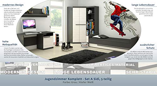 Jugendzimmer Komplett – Set A Sidi, 5-teilig, Farbe: Grau / Kiefer Weiß