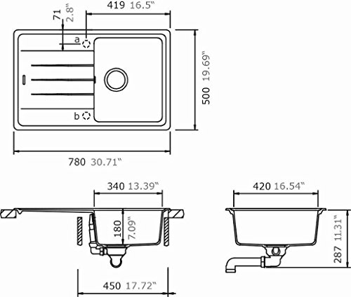 Granitspüle der Serie Victory Made in Germany Durch den hohen Anteil von 80% an mineralischem Quarz erhält die Spüle eine wunderschöne Granitstruktur und ist gleichzeitig hervorragend für die Belastungen in der Küche geeignet. Details und Merkmale: – ab 45/50 er Unterschrank – reversibel (Becken kann links bzw. rechtsseitig eingebaut werden) – extrem hartes, kratzfestes und durchgefärbtes Material – glatte und versiegelte Oberfläche dadurch sehr leicht zu reinigen – hitzebeständig bis 240°C – vorgebohrte Sollbruchstellen für Armatur und Drehexcenter bitte beiliegende Montageanleitung beachten – Überlauf im Becken Lieferumfang: – inklusive Drehexcenter – inklusive Ab- und Überlaufgarnitur – inklusive Befestigungsmaterial Maße: – Außenmaß: 780 x 500 mm – Beckentiefe: 180 mm – Hahnloch: d = 35 mm – Materialstärke: 10 mm – Ausschnittmaß: 760 x 480 mm