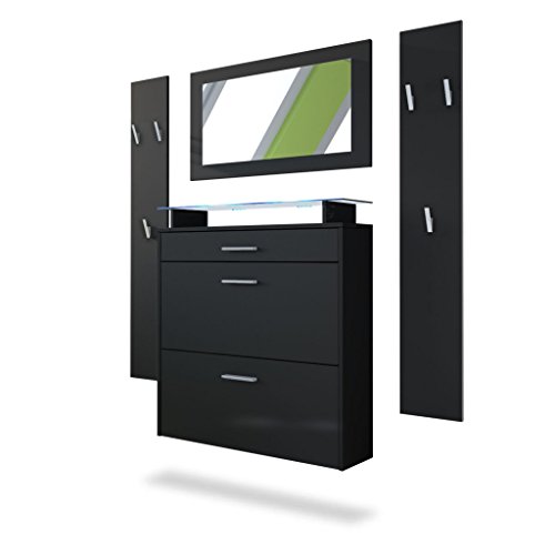 Herzstück bildet ein Hängeschuhschrank mit einem Schubkasten und einer Glasablage. Dieser hat 2 doppelreihige Kippvorrichtungen, in denen abhängig von Form und Größe bis zu 16 Paar Schuhe Platz finden. Ein Schubkasten bietet Stauraum für Ihre alltäglichen Accessoires. Eine Glasablage unterstreicht das moderne Design und bietet eine praktische Ablage. Das Garderobenpaneel hat 4 Hut- und 2 Mantelhaken und eine Ablage. Der Spiegel kann sowohl waagerecht als auch senkrecht montiert werden.
