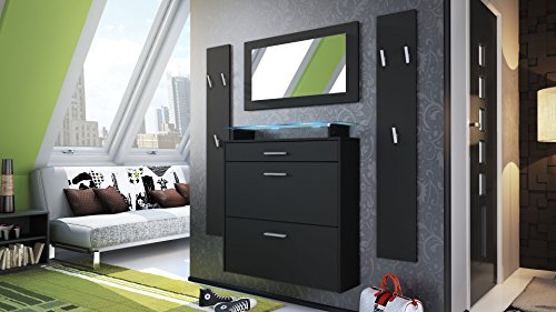 Herzstück bildet ein Hängeschuhschrank mit einem Schubkasten und einer Glasablage. Dieser hat 2 doppelreihige Kippvorrichtungen, in denen abhängig von Form und Größe bis zu 16 Paar Schuhe Platz finden. Ein Schubkasten bietet Stauraum für Ihre alltäglichen Accessoires. Eine Glasablage unterstreicht das moderne Design und bietet eine praktische Ablage. Das Garderobenpaneel hat 4 Hut- und 2 Mantelhaken und eine Ablage. Der Spiegel kann sowohl waagerecht als auch senkrecht montiert werden.