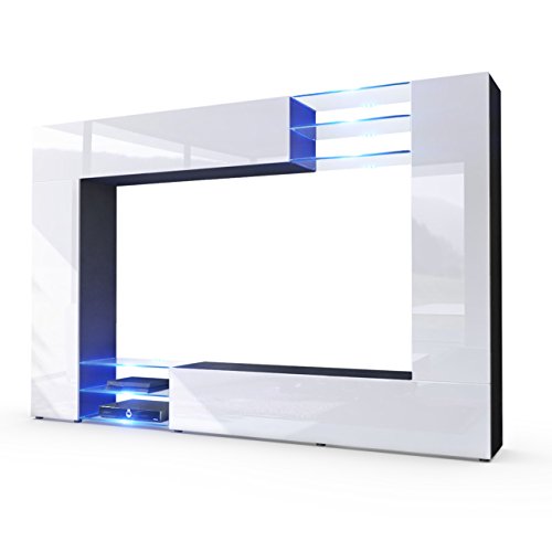 Wer sein Heimkinosystem gelungen präsentieren möchte wird mit der Wohnwand Mirage vollends zufrieden sein. Mit ihr bringen Sie ein harmonisches Ambiente in Ihr Wohnzimmer und Ihre Heimelektronik wird gekonnt, aber dennoch zurückhaltend integriert. Hinter den hochwertigen Hochglanzfronten befinden sich zahlreiche ausgeklügelte Ablagemöglichkeiten. Auf der rechten und linken Seite der Wohnwand befinden sich Stauraumelemente mit je zwei Einlegeböden hinter den Türen. Unten rechts und oben links gibt es zudem noch zwei Klappenelemente mit je zwei weiteren Fächern. Als designtechnisches Highlight werden die Elemente an zwei Stellen von dekorativen Glasregalen verbunden. Diese können mit der optional erhältlichen LED-Beleuchtung akzentuiert werden. Die LED Beleuchtung in RGB besteht aus 6 Glaskantenclips. Die 16 verschiedenen Farben können über die mitgelieferte Fernbedienung gesteuert werden.Der Korpus (Oberböden und Seiten) ist in einem matten Schwarz gehalten. Die Fronten der Türen und Klappen bestehen aus MDF und sind entweder in Hochglanz oder mit naturrealistischer Maserung, jeweils mit abgerundeten Kanten verfügbar. Die naturrealistischen Oberflächen der Farben Avola-Champagner, Avola-Anthrazit und Eiche sägerau weisen eine feine Reliefstruktur auf.Um die schlichte Optik zu unterstreichen, wurde gänzlich auf Griffe verzichtet. Die Türen und Klappen werden über eingefräste Griffmulden geöffnet. Das Montagezubehör ist aus Metall und sorgt für eine stabile Montage. Eine einfache bebilderte Aufbauanleitung bietet reichlich Unterstützung bei der Selbstmontage.Maße der Wohnwand in cm (BxHxT): 262 x 183 x 39Die abgebildete LED-Beleuchtung ist in dieser Auswahl im Bestellumfang enthalten. Wenn Sie den Artikel ohne LED-Beleuchtung wünschen, nutzen Sie hierfür bitte die obenliegende Auswahlfunktion.