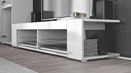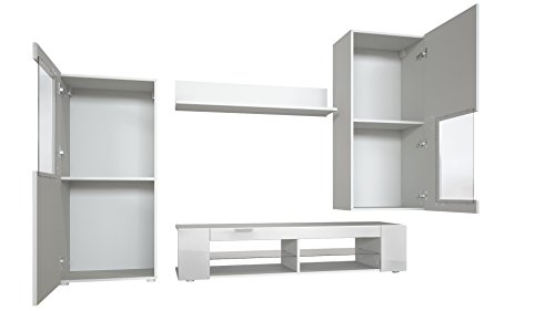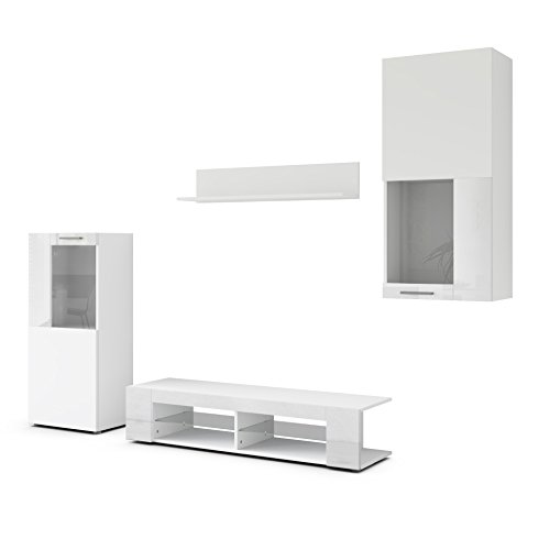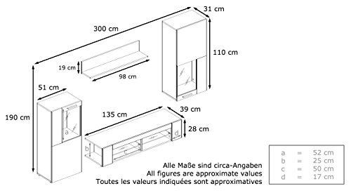 Modernes, junges Design trifft auf praktische Funktionalität im besten Preis-Leistungsverhältnis.Die Movie Wohnwand besteht aus einem TV Board, zwei Design-Vitrinen und einem zusätzlichen praktischen Wandregal. Alle 4 Elemente lassen sich individuell zusammenstellen und bieten Ihnen grenzenlose Gestaltungsmöglichkeiten für Ihr Wohnzimmer: egal ob hängend oder stehend, nebeneinander oder verteilt im Raum. Die Movie Wohnwand passt sich Ihren Wünschen und Wohnideen spielend an.Das zentrale TV Board eignet sich für jeden Wohnraum und dank des modernen offenen Designs findet sich Platz für Ihre gesamte Media-Ausstattung. Aufgewertet wird das Board durch verstellbare Glasböden und verblendete Seitenfächer an den Abschlüssen. Der Oberboden bietet sicheren Stand auch für große Fernseher.Die eleganten Vitrinen bestechen durch Ihren aufwändigen Holz-Glas-Mix. Dank eines zusätzlichen Bodens bieten die beiden Vitrinen extra Stauraum und gleichzeitig durch die Glastüren auch die Möglichkeit, Ihre Lieblingsobjekte geschützt in einem eleganten Rahmen besonders darzustellen – insbesondere mit unserer optionalen LED-Beleuchtung. Beide Vitrinen lassen sich sowohl hängend als auch auf dem Boden platzieren.Als zusätzliches Designelement lässt sich das Wandregal einfach und unkompliziert überall montieren und bietet Platz für Ihre Accessoires oder Bücher. Dank einer einfachen und unsichtbaren Aufhängevorrichtung auf der Rückseite gibt es keine unschönen sichtbaren Verschraubungen und das klare Design bliebt einmalig leicht und schön. Stellmaße der Wohnwand wie abgebildet in cm (BxHxT): 300 x 190 x 37Bitte beachten Sie, dass bei dieser Auswahl die LED Beleuchtung nicht inklusive ist. Wenn Sie die Wohnwand mit Beleuchtung wünschen wählen Sie dies bitte in der Auswahlfunktion oben.